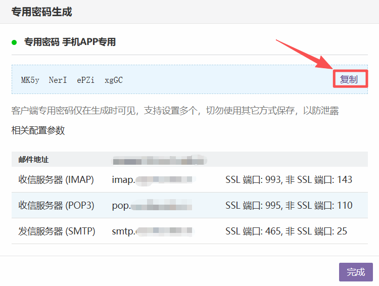将页面显示的随机字符复制,填入客户端(如手机邮件App)的“密码”中