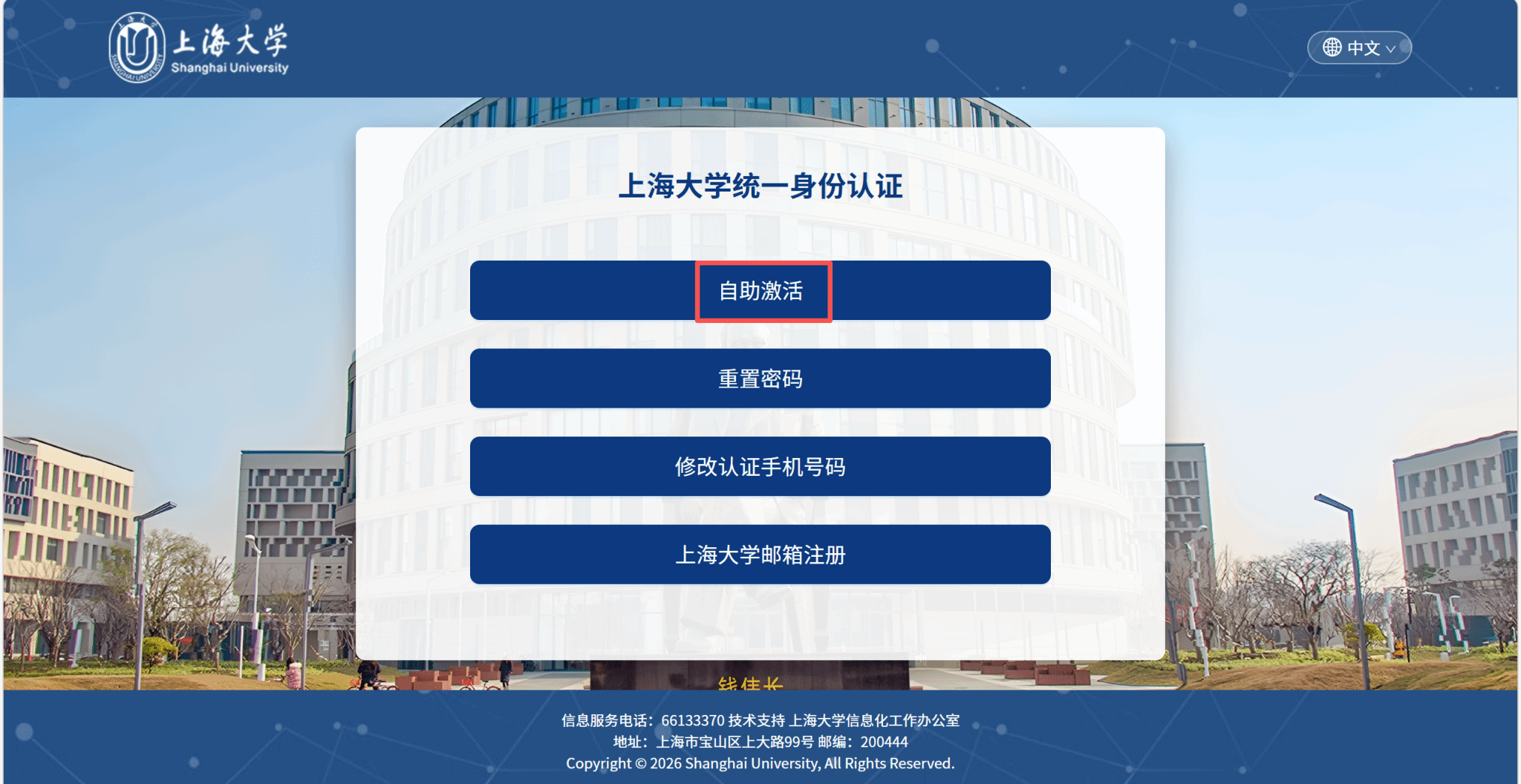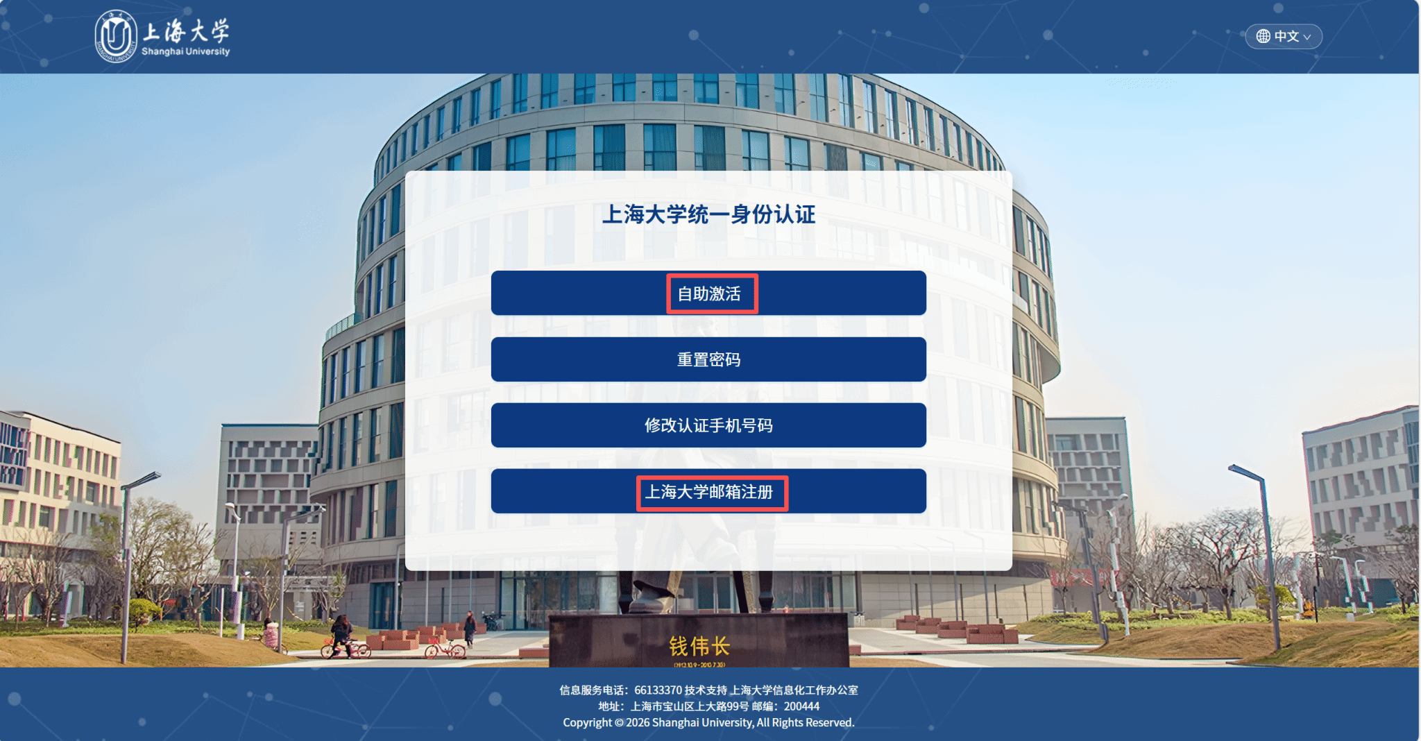 已做过这些邮件域邮箱自助激活的用户,直接访问https://newmail.shu.edu.cn,用对应这些邮箱名的学/工号进行登录,并经过短信二次验证后进入邮件系统。如果没做过邮箱自助激活,务必先按照下面步骤进行账号自助激活。